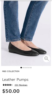My save find – Marks and Spencer’s Leather Pump. These suckers are the best and come in at $50. I wear these constantly at conventions. They are super comfy, like wearing sneakers. They don’t rub or give me blisters, and I can wear them for days on end. I love that the toe is a little more pointed. They work with my casual clothes and work attire alike! I love them so much I got them in the two tone nude & black too. They look like the classic Chanel two tone ballerina flats. Sadly, they don’t have these any more. These shoes fit true to size as well.