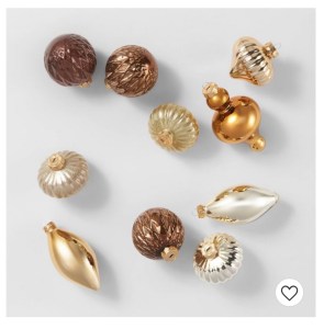 My decorations mostly came from Target. I always use some type of ribbon for garland and then decorate with coordinated colors. I got them a few years ago so I couldn’t find an exact match but the below ones are close.