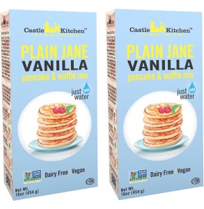 He makes them from scratch so they take a little while to whip up. I just found a new pancake mix that is really good and will do in a pinch. My friend recommended I try Castle Kitchen’s Plain Jane Vanilla Pancake & Waffle Mix.