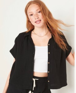 I picked the Flutter-Sleeve Smocked Cut Out Blouse in a large as well. I love that I can wear this shirt with my cutoffs or my black linen pants. On sale for $31 with the extra 35% off.