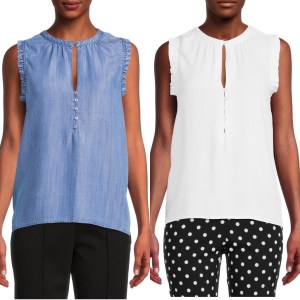 I wanted some lightweight tops for our upcoming trip to AL. It’ll be over 90 degrees with at least 80% humidity so I don’t want to be any more uncomfortable than necessary. I picked Time & Tru’s chambray sleeveless top. I like that I can button the top or leave it open. I thought the ruffles were a cute touch without being over the top. I’ll wear it with my white linen pants. I went with a size large. Also grabbed it in white.