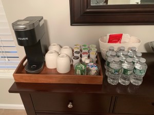 Over the years, I’ve learned some tricks to help. First, I stock their bedroom with water, coffee, and tea. Nothing fancy, just some small bottles of water. We have a single cup Keurig I leave in there with a selection of coffee & tea. Some people are early risers and worry about waking up the rest of the house. This way, they don’t have to leave their room. I have different creamers and types of sweetener. Just make sure you leave a trash can nearby for the waste. I use regular coffee mugs but you could always use disposable cups.